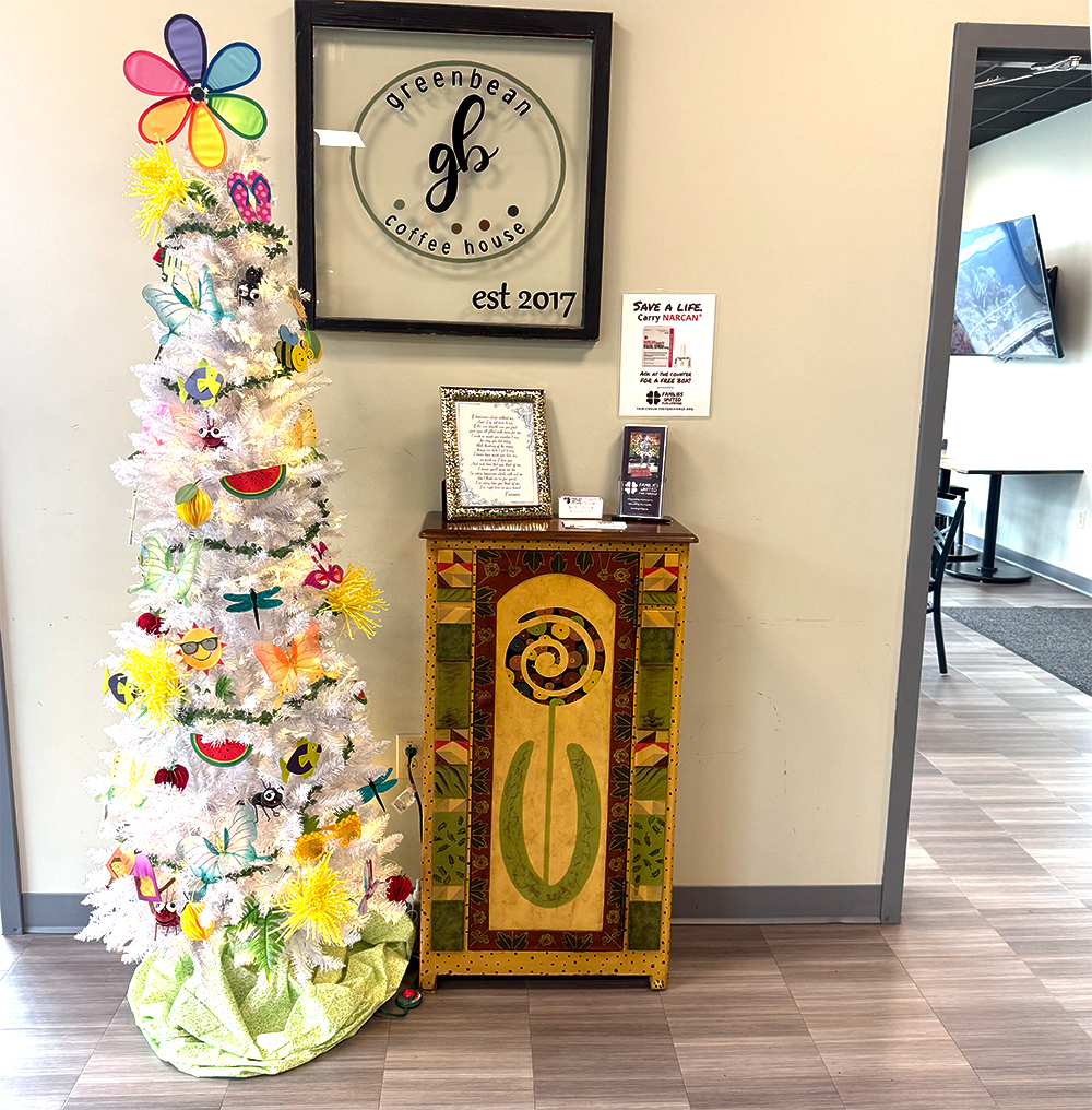 This tree changes throughout the months to accomodate each season. It is currently housed in the Greenbean Coffee house in Altoona, where you can also get NARCAN® for free at the counter. This tree stands as a moving symbol of loss, love, and the ongoing effort to bring awareness to the addiction crisis.
